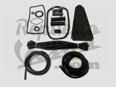 Kit gomas en color negro, se incluye la gomaespuma de la puerta de la guantera, goma claxon, goma base cuentakilómetros, goma tapón depósito, goma base depósito, tacos caballete, puños, goma tope pedal freno trasero, goma pedal de freno, alfombrilla central, goma guías suelo, goma guantera y gomas cofanos, válido para Vespa 160 y GT.