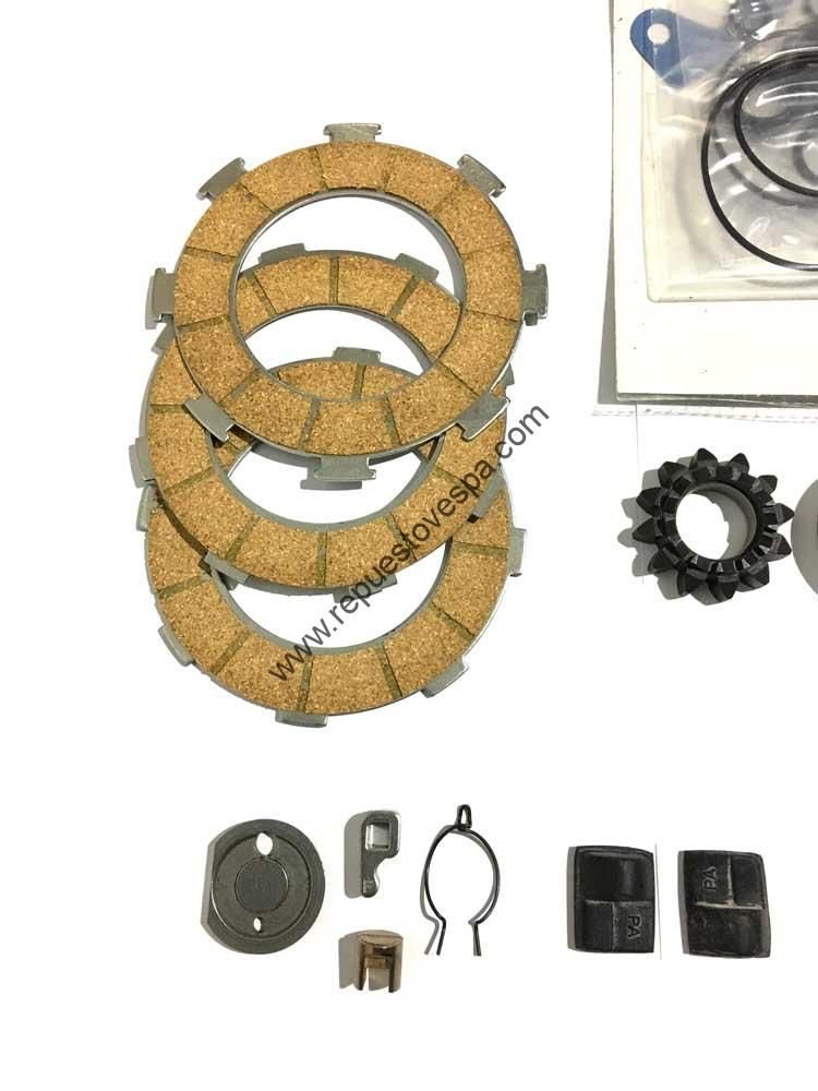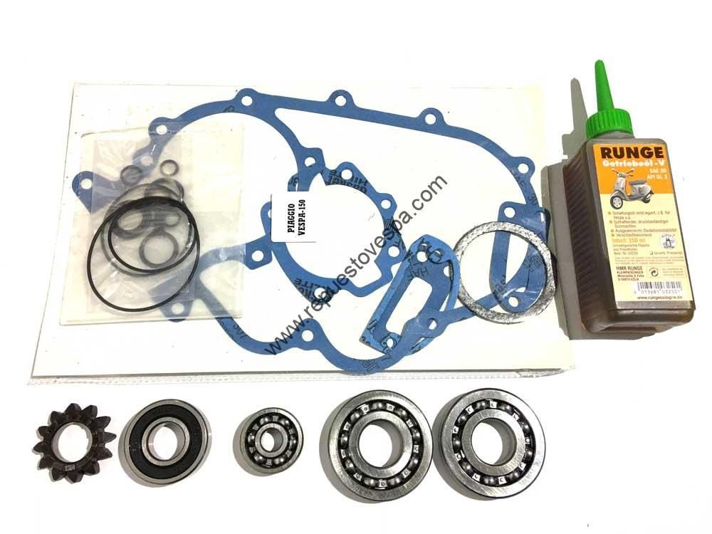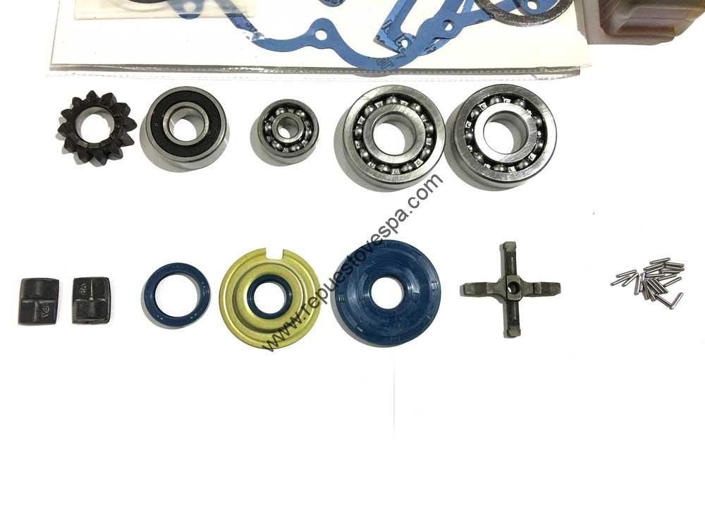 Se compone de: Aceite Sae 30 250 ml, juntas motor, tóricas, cruceta, juego retenes y rodamientos, discos de corcho, empujador embrague, kit 21 agujas rodamiento primario y piñón de arranque.