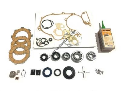 Se compone de: Aceite Sae 30 250 ml, juntas motor, tóricas, cruceta, juego retenes y rodamientos, discos de corcho, empujador embrague, kit 21 agujas rodamiento primario y piñón de arranque.